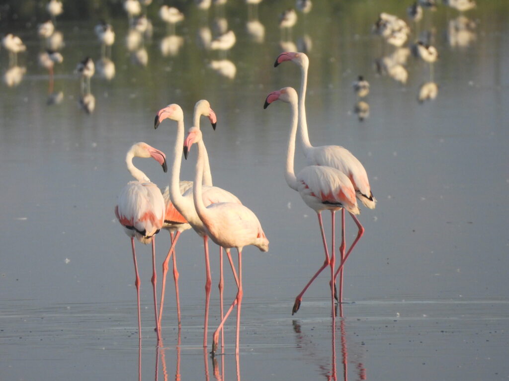 The flamingos (family Phoenicopteridae) are a family of birds belonging to the monotypic order Phoenicopteriformes. These wading birds have specialized upside down bills adapted to filtering water mainly for brine shrimp and other plankton on mud. Their food is rich in carotenes, giving them a characteristic pink plumage. They forage in large flocks known as flamboyances, performing synchronized ritualized courtship displays and and breeding colonially in mud nests, feeding the chicks crop milk.