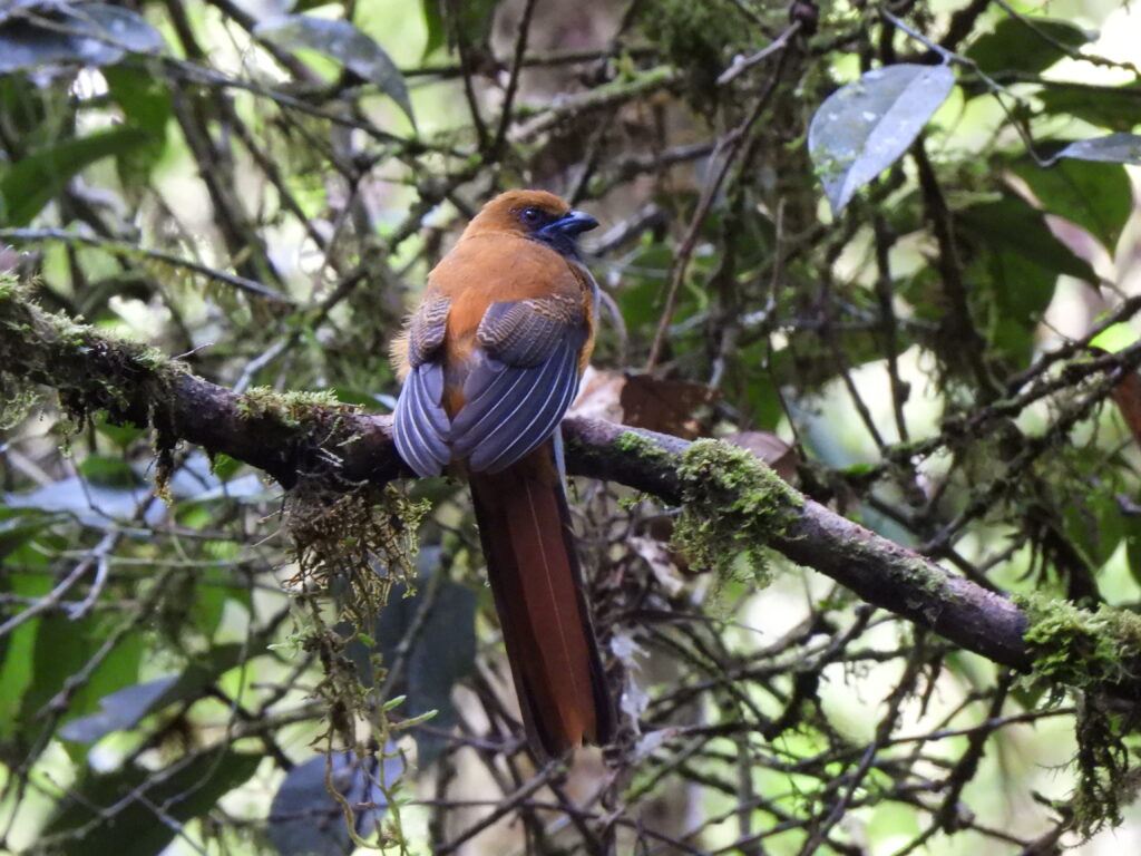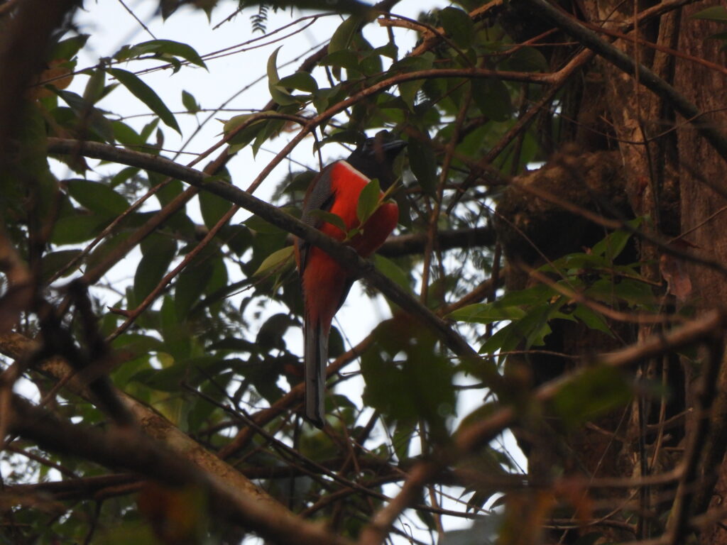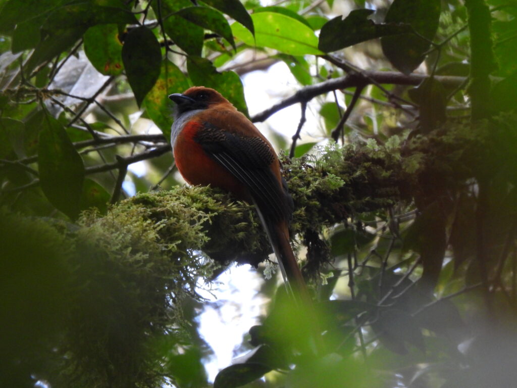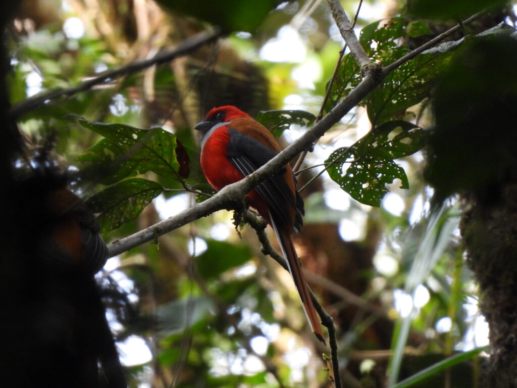 The trogons (family Trogonidae) are a family of birds belonging to the monotypic order Trogoniformes distributed across tropical regions across the globe. These birds are strictly arboreal and generally inactive, sitting still on branches in the canopy for long periods. This behavior makes it often difficult to spot them, despite the bright-colored plumage of all members of the family. They are monogamous, breed in tree holes and defend their territories, so they are often best detected by their voice.