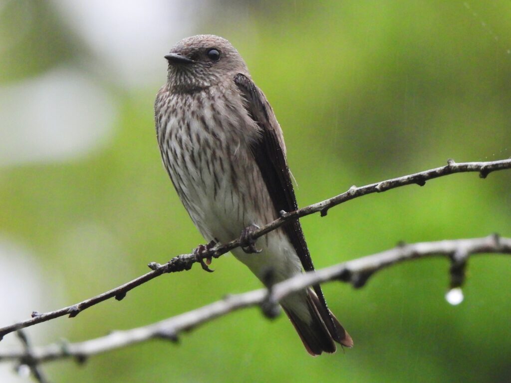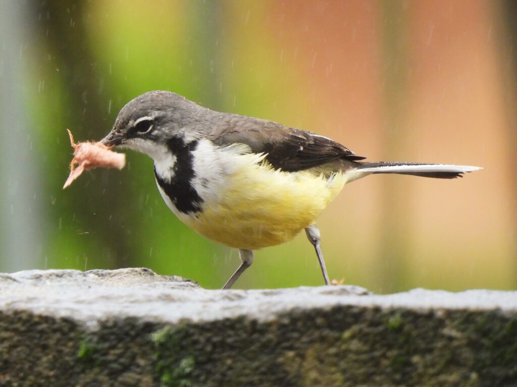 Madagascar wagtail (Motacilla flaviventris) feeding on an unwary moth under a drizzle, 7 Nov 2023