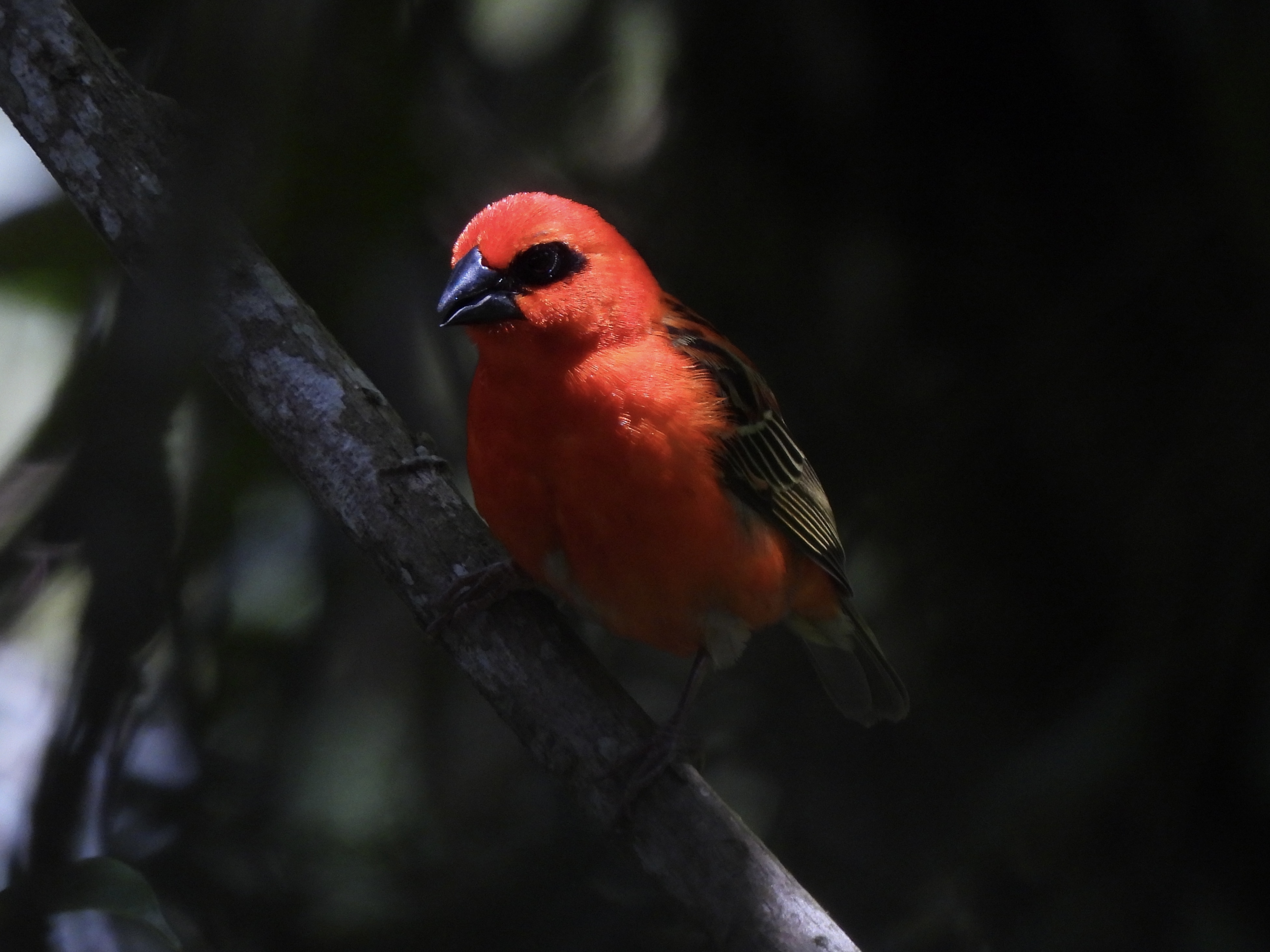Black and red: male red fody (Foudia madagascariensis) by CVB’s restaurant, 26 Nov 2023