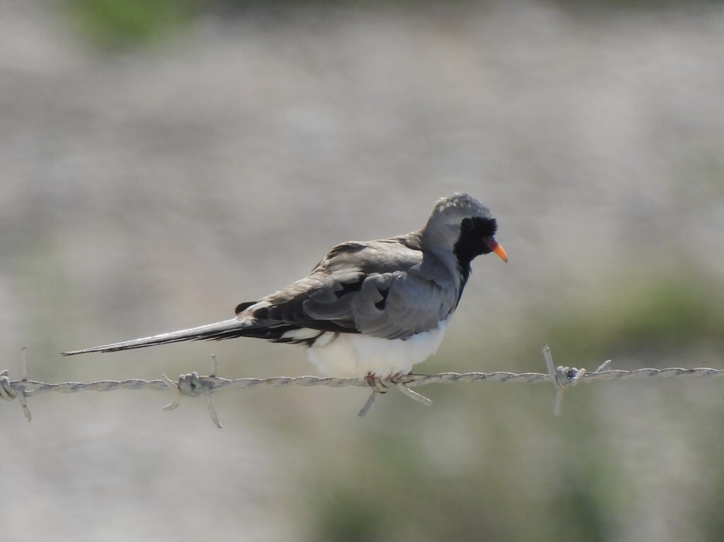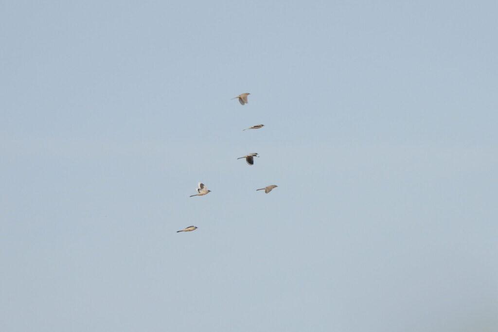 As we moved deeper into the oasis, we checked every bird flying over. The number of fly‑by laughing doves and Eurasian collared doves (Streptopelia decaocto) kept us on edge. However, after some patience, Aina eventually connected with a flock of distinctive, elegant, long‑tailed birds with a pied wing pattern. There they were.