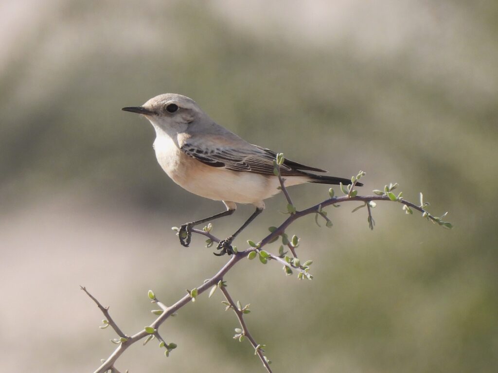 Still, we were fully satisfied. I had long explained to Aina all I knew about the natural history and phylogeny of this puzzling, elegant desert‑dweller, and I felt we were both equally excited. At the time, the hypocolius became my world bird #500. That number, however, quickly increased on our walk back to the car, as I connected with two obliging lifers: desert wheatear (Oenanthe deserti) and isabelline wheatear (Oenanthe isabellina).