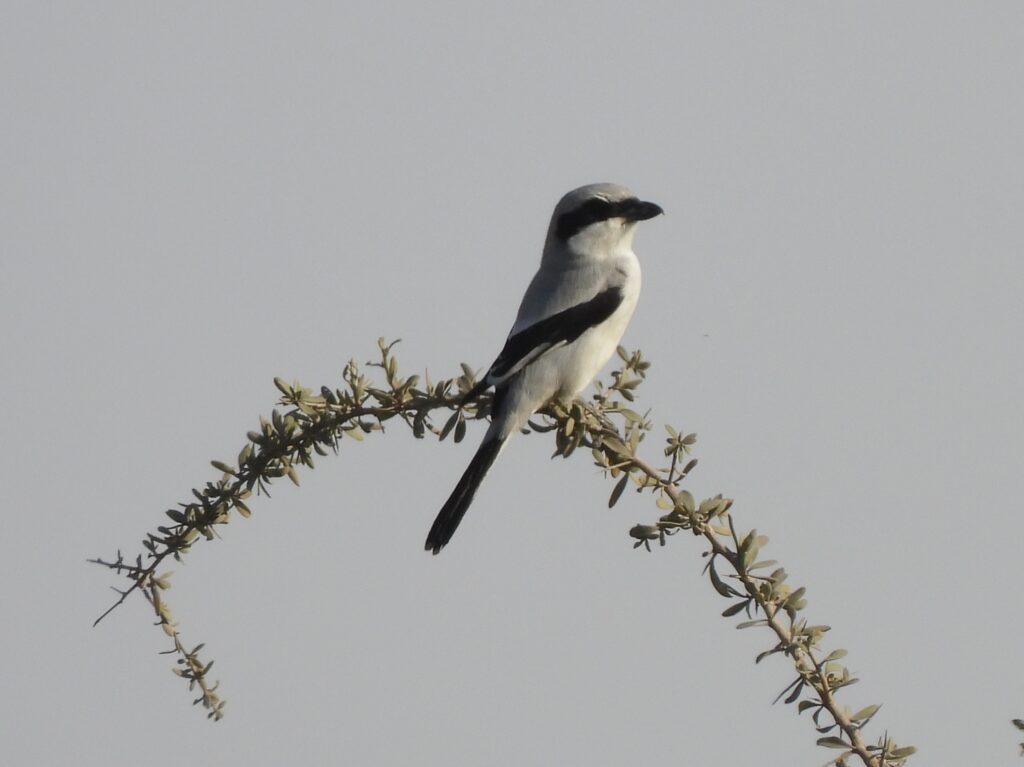 Our walk to the oasis was fast and uneventful. We soon reached an area with increasingly tall, dense shrubs. Here we could hear different birds, including delicate prinia (Prinia lepida), blackcap (Sylvia atricapilla) and others I was not able to identify at the time. Some individuals of the Arabian aucheri form of great grey shrike (Lanius excubitor) sat on top of twigs.