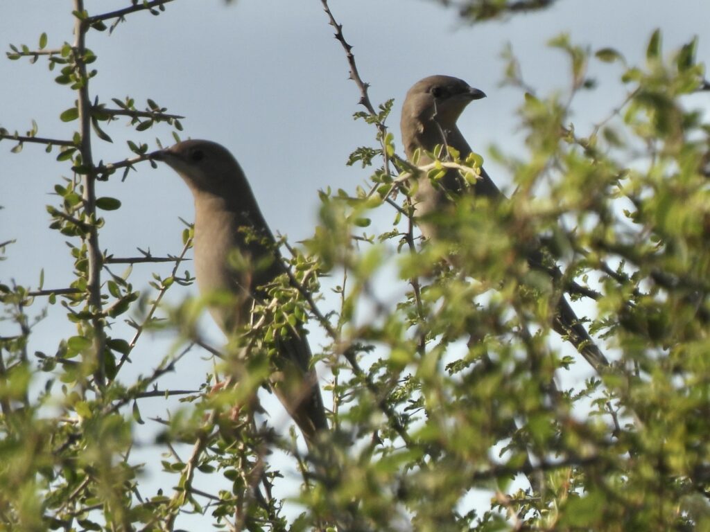 We had a brief but very exciting encounter with the hypocolius, flying back and forth between bushes. The birds stayed mostly out of sight, best seen as they flew over, although they offered quick peeks from bush tops. Our whole observation lasted only a few minutes; after that, we did not reconnect with them.