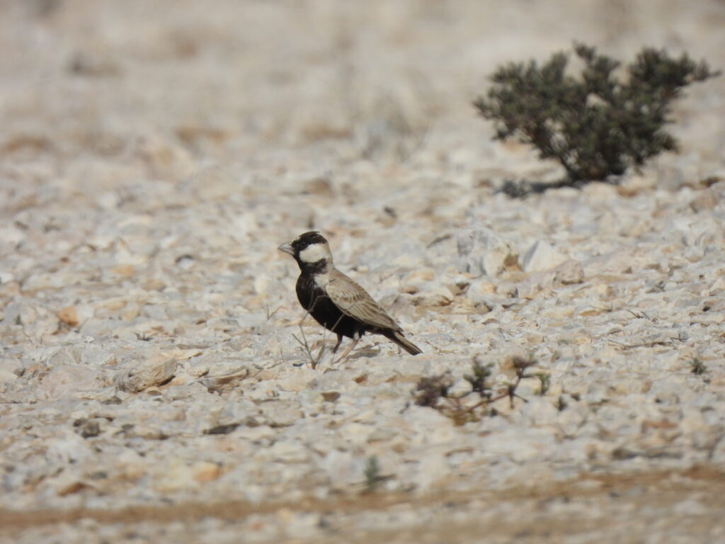 We headed towards the northwest of the country. A couple of stops for scenic pictures while driving unpaved roads on the way to Al Wakra village resulted in several territorial black-crowned sparrow‑larks (Eremopterix nigriceps). We enjoyed fantastic views of these small but nicely patterned larks, in contrast with some larger, duller crested larks (Galerida cristata) also present.