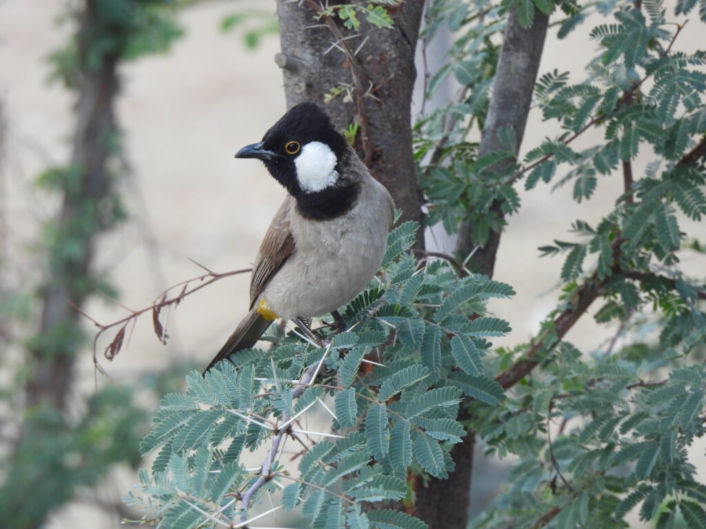 Back on the road, we headed to the only spot in the country where hypocolius had been reported on eBird that season — and on several dates. This involved diverting from highways onto secondary roads, which allowed us to connect with more birds along the way. We noted fly‑by common mynas (Acridotheres tristis), white-eared bulbuls (Pycnonotus leucotis) and laughing doves (Spilopelia senegalensis). On a couple of occasions, we noticed large falcons flying over wastelands next to the road. I quickly realized falconry is a big thing here, as numerous 4×4 cars with a single driver and several falcons on the seats shared the same unpaved roads with our rather humble rental car.