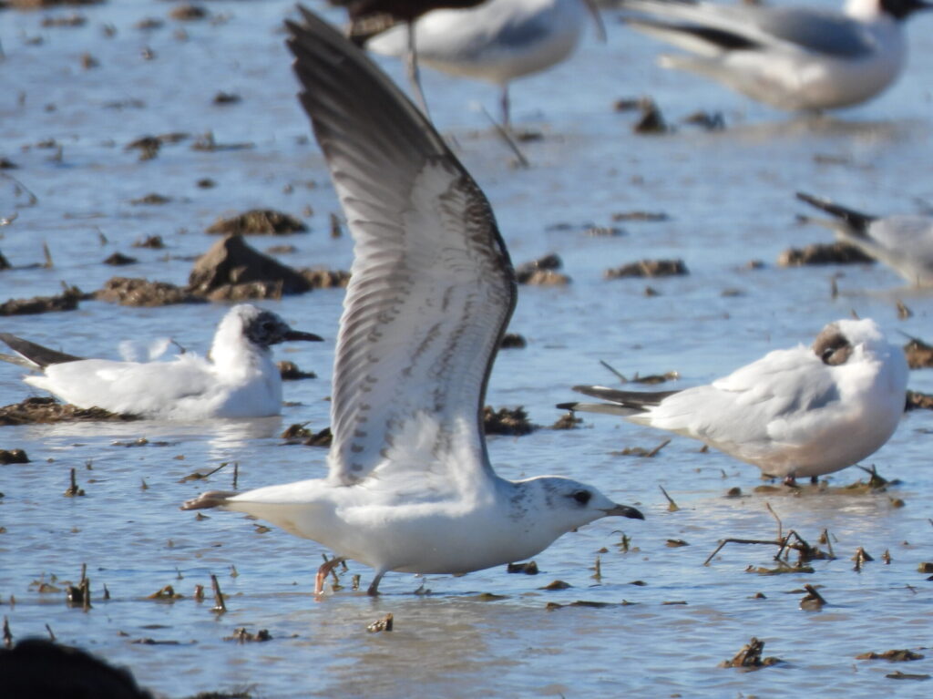 The winds surely played a huge role in bringing some top birds to Santa Pola harbour. Even though trawlers had stopped fishing for some days, Marcos Real and Óscar Aldeguer reported common gull (Larus canus) and black-legged kittiwake (Rissa tridactyla) on the beaches and over the harbour buildings. Numerous birdwatchers drove to Santa Pola after connecting with the El Hondo wheatear and took pictures of the birds present. Over several days, Marcos and Darío carefully noted all the different individuals found. Eventually, this included two common gulls (a first-winter and an adult) and up to four different adult black-legged kittiwakes. A record-breaking total of six different kittiwakes (including birds in Altea and Cap de la Nau) were reported in the Alicante region during February. We also heard of individuals well inland across the Iberian Peninsula, likely blown in by the windstorms. Let’s see what numbers will be like in a few days during passage, now that the winds are due to change.