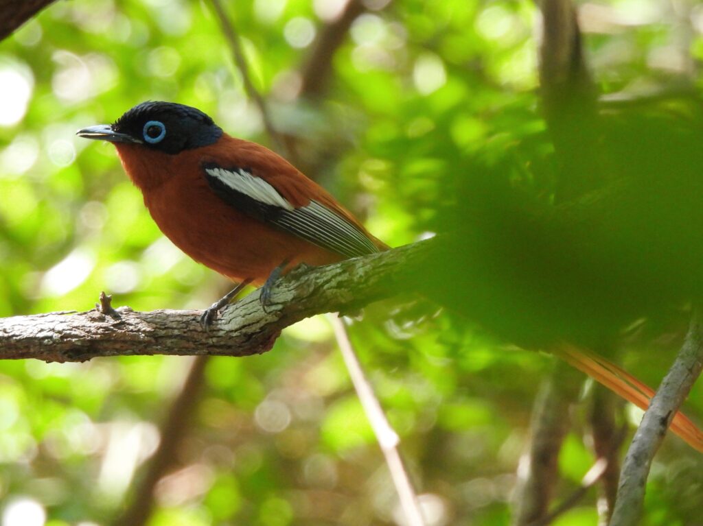 Bird-wise, the morning was promising. The forest was full of bird songs in the early morning, in Madagascar standards — by then I had learned that the soundscape in Malagasy forests is dominated by insects and frogs, then lemurs and finally birds. Malagasy turtle doves (Nesoenas picturatus), crested couas (Coua cristata), Madagascar cuckoos (Cuculus rochii), cuckoo-roller (Leptosomus discolor) and common newtonia (Newtonia brunneicauda) were heard during our walk. Males of Malagasy paradise flycatchers (Terpsiphone mutata) were also present and showed off their fine looks.