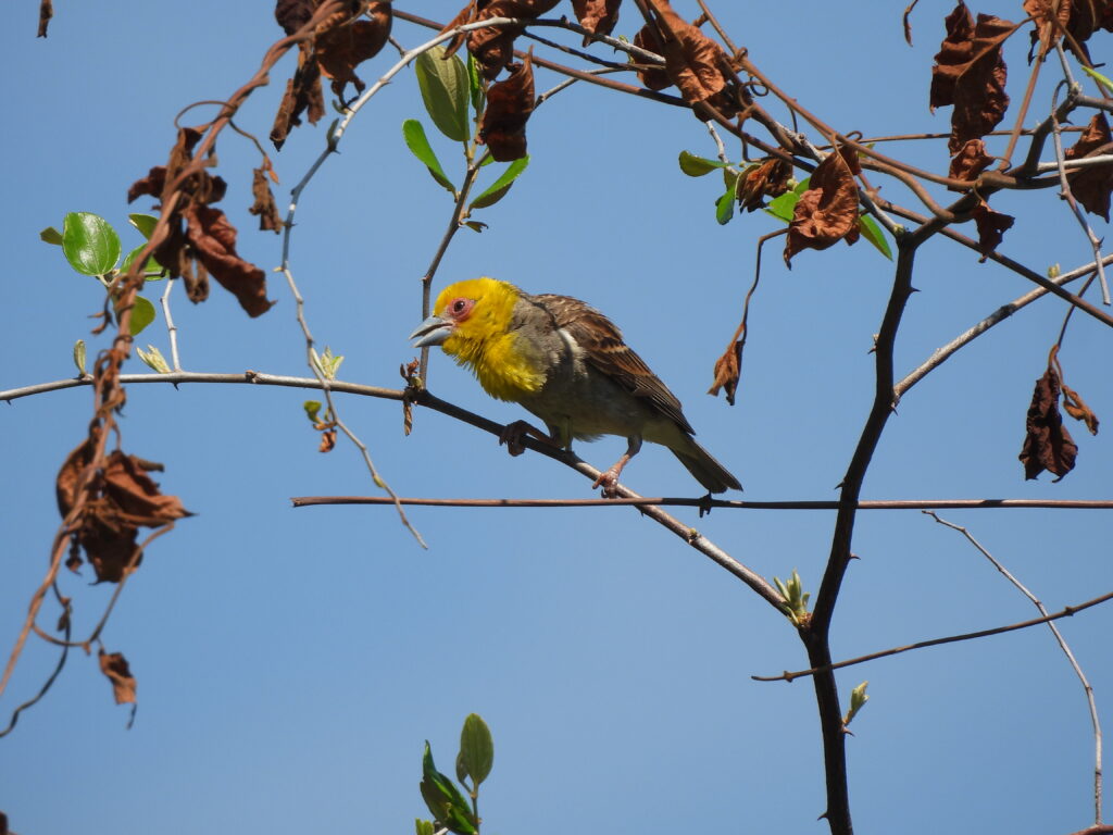 The next morning, my guide and I ventured into another one of the trails. Circuit Retendrika is a route north of the lake on a tall, relatively humid forest on red sand. My visit started at 06:00 and the walk to the junction on the north part of Ravelobe goes through the little tree where we had seen the Madagascar fish eagle, and some trees where Sakalava weavers (Ploceus sakalava) bred, providing good views. Common jeries (Neomixis tenella) and Malagasy sunbirds (Cinnyris notatus) foraged in the trees while olive bee-eaters (Merops superciliosus) and Mascarene martins (Phedina borbonica) caught insects over the water surface. On this area, locals showed me two giant colorful stick insects of an endemic species (Achrioptera maroloko) on a walk at some point.