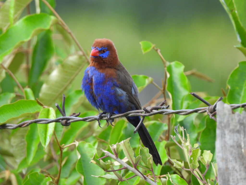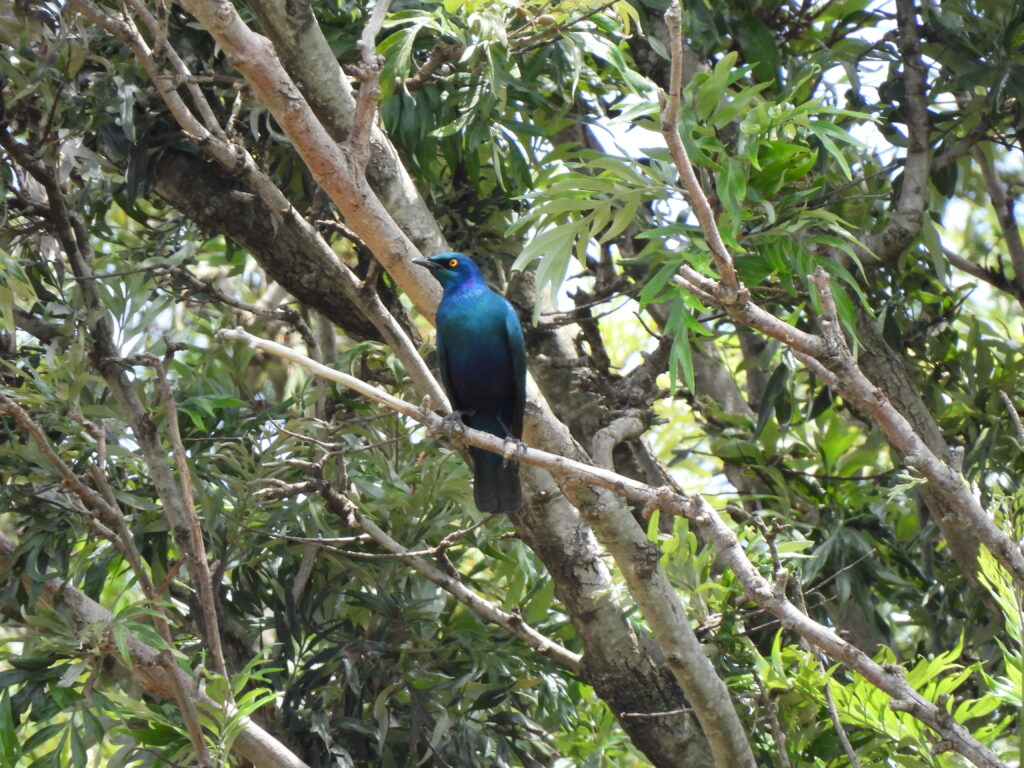 Bird-wise, the lodge gardens were paradise. Bronze sunbirds (Nectarinia kilimensis), speckled pigeons (Columba guinea), superb starlings (Lamprotornis superbus), greater blue-eared starlings (Lamprotornis chalybaeus) and red-billed oxpeckers (Buphagus erythrorhynchos) were almost always in sight. Purple grenadiers (Granatina ianthinogaster), common bulbuls (Pycnonotus barbatus), northern gray-headed sparrows (Passer griseus) and vitelline masked-weavers (Ploceus vitellinus) foraged in the bush. A northern fiscal (Lanius humeralis) was constantly feeding a fledgling.
