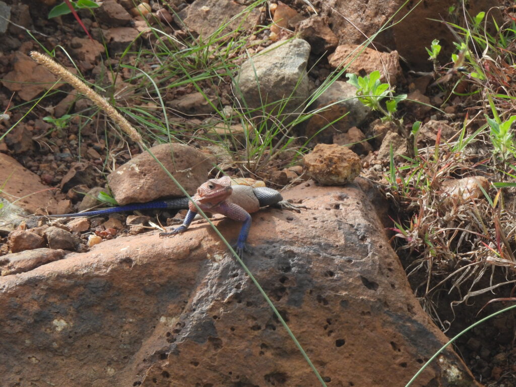 We also interviewed locals in Talek village, right next to one of the main gates to the Maasai Mara National Reserve. We were accommodated at a certain distance from Talek, which allowed us to connect with different birds along the road: straw-tailed whydahs (Vidua fischeri), silverbirds (Empidornis semipartitus), capped wheatears (Oenanthe pileata), and red-cheeked cordon-bleus (Uraeginthus bengalus), as well as black-backed jackals (Lupulella mesomelas). Once, we even found a family of banded mongooses (Mungos mungo). However, the most notorious inhabitants of some stretches of the road were the endemic Mwanza flat-headed rock agamas (Agama mwanzae), showing off their beautiful red-and-blue looks.