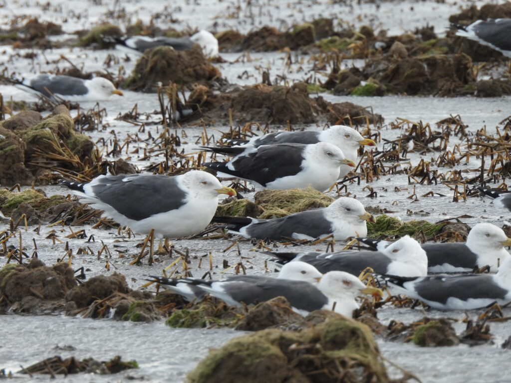 Relocated 1st-winter “Guilvinec gull” (Larus fuscus × Larus argentatus) among lesser black-backed gulls (Larus fuscus) in l’Estell, 14 Feb 2026