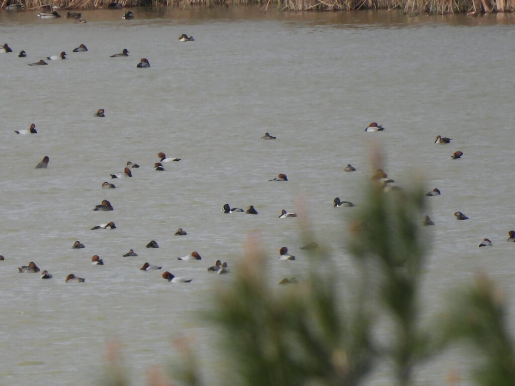 Finally, the time had come. We reached the tower at Racó de l’Olla and looked at hundreds of ducks in nearby Mata del Fang. Two males and a female ring-necked duck (Aythya collaris) previously found by Martín had gone unreported for several days. After some scoping, there they were. For most of us, it was the first time seeing the striking adult male, let alone alongside some 11 tufted ducks (Aythya fuligula), three ferruginous ducks (Aythya nyroca), two ferruginous duck × common pochard (Aythya ferina) hybrids, around 20 pintails (Anas acuta) and numerous red-crested pochards (Netta rufina).