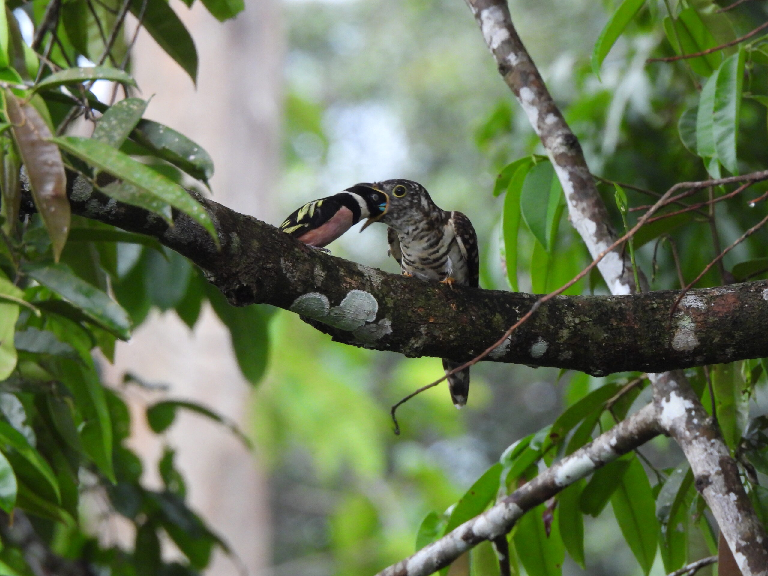 Indian cuckoo (Cuculus micropterus) being fed by a black-and-yellow broadbill (Eurylaimus ochromalus)
