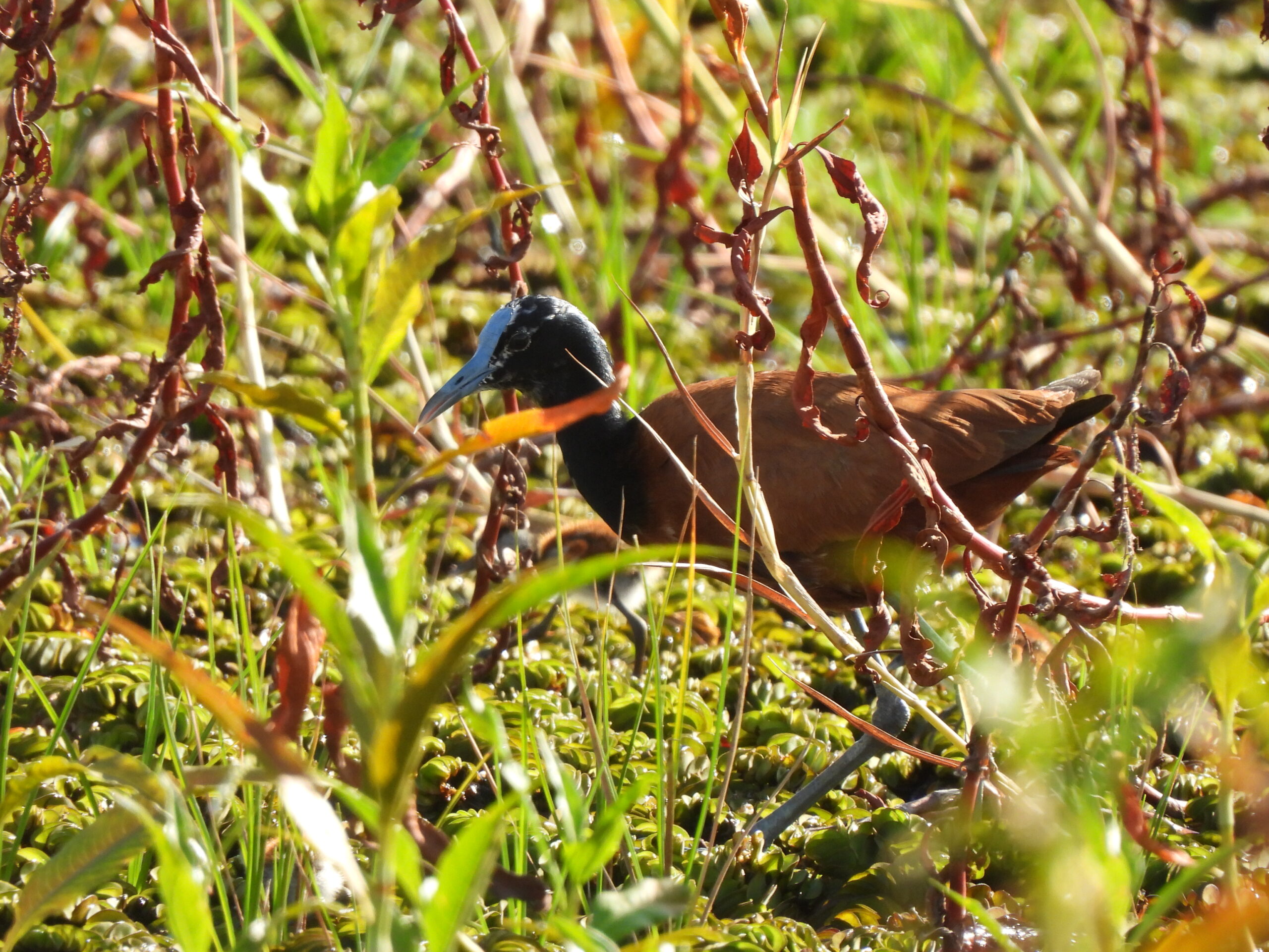 Inhabitant of ponds and lakes with well developed floating vegetation in the Indian Subcontinent and Southeast Asia. Adults are the only jacanas with a black body pattern, and all age groups show shiny brown wings. I have seen this species in Cambodia and India.