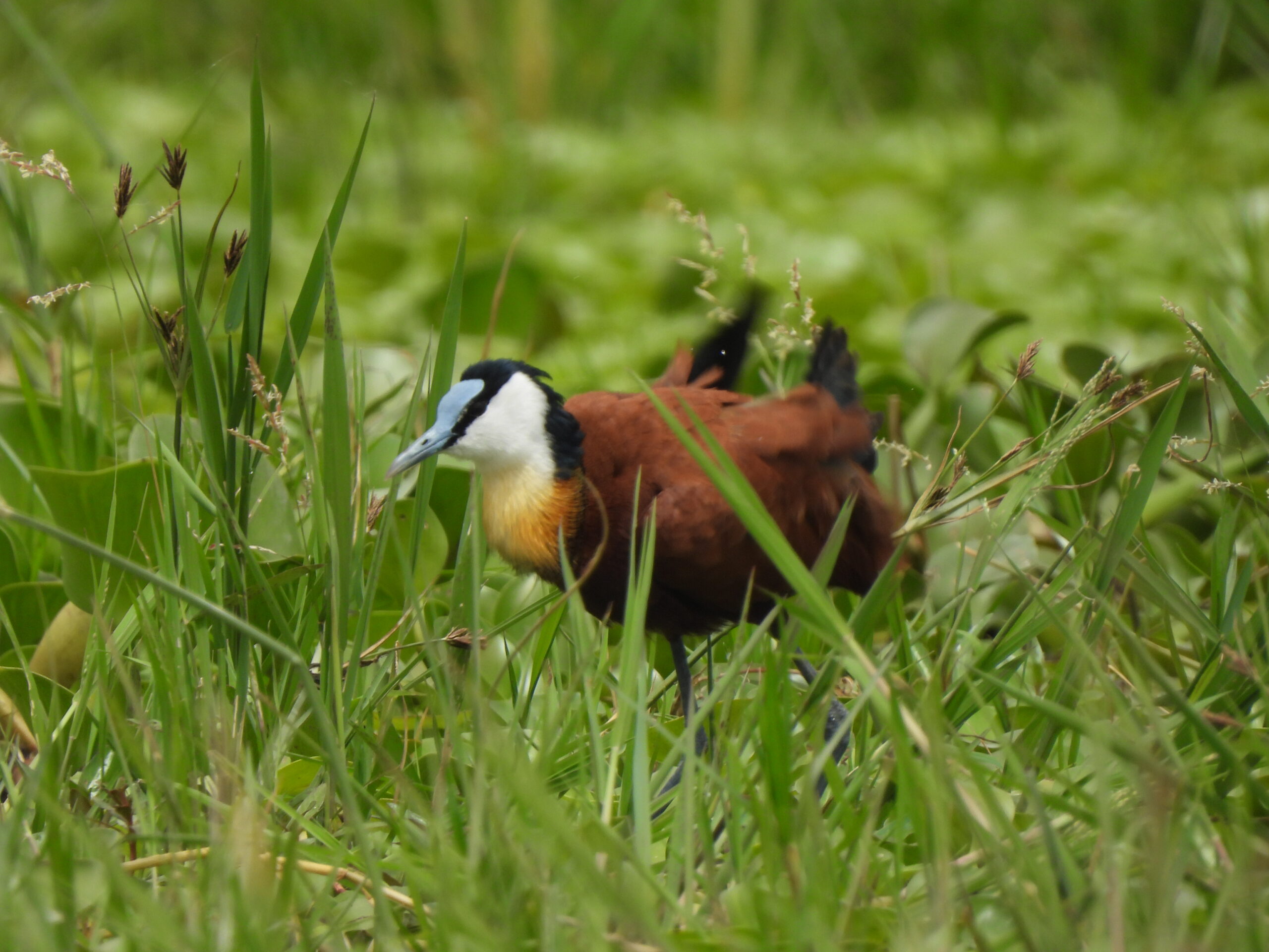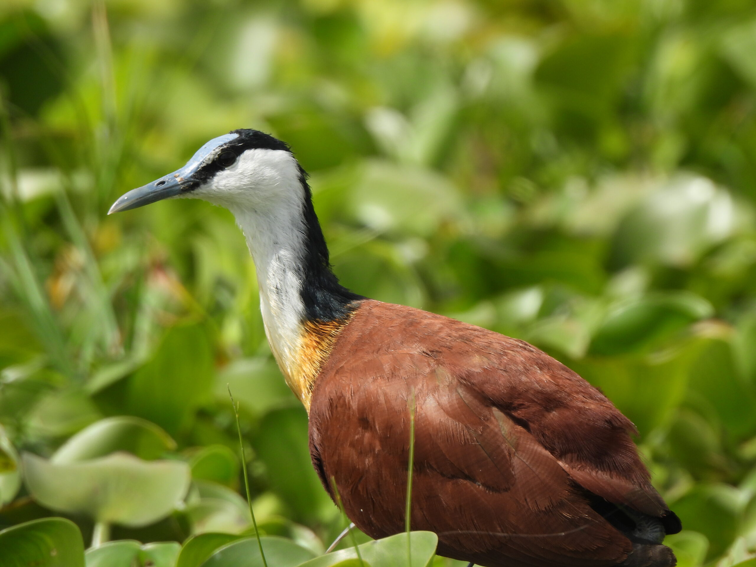 The most abundant jacana of Subsaharan Africa, from Senegal or Sudan to South Africa, with resident and nomadic populations occurring in lakes and ponds with floating vegetation. Although all age groups have a black nape and a white head and neck, only adults show the bright blue bill and shield. I have encountered this species in Kenya.