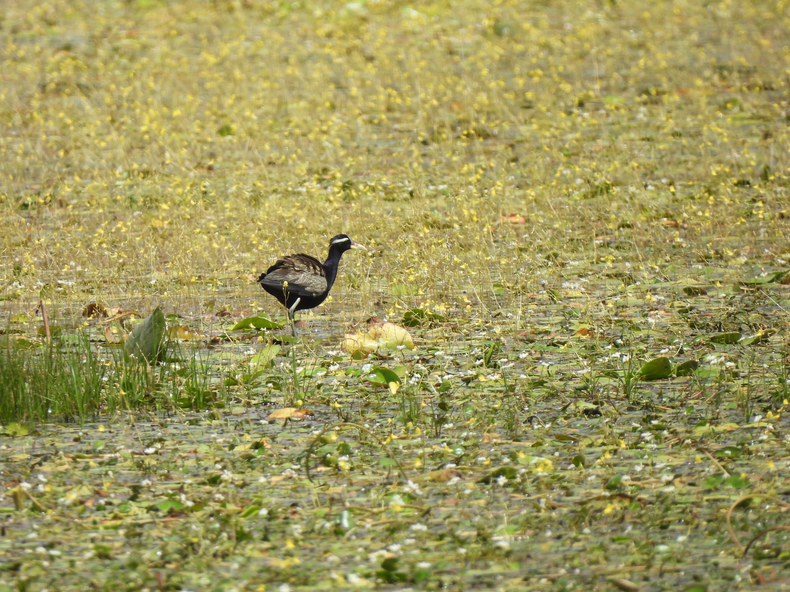 Stunning jacana distributed throughout southern Asia from Yemen in the Arabian Peninsula to the Philippines and Borneo, with some migratory movements in part of the range. Unique among the family for showing long tail feathers in breeding plumage. I have observed this species in paddyfields of south India.