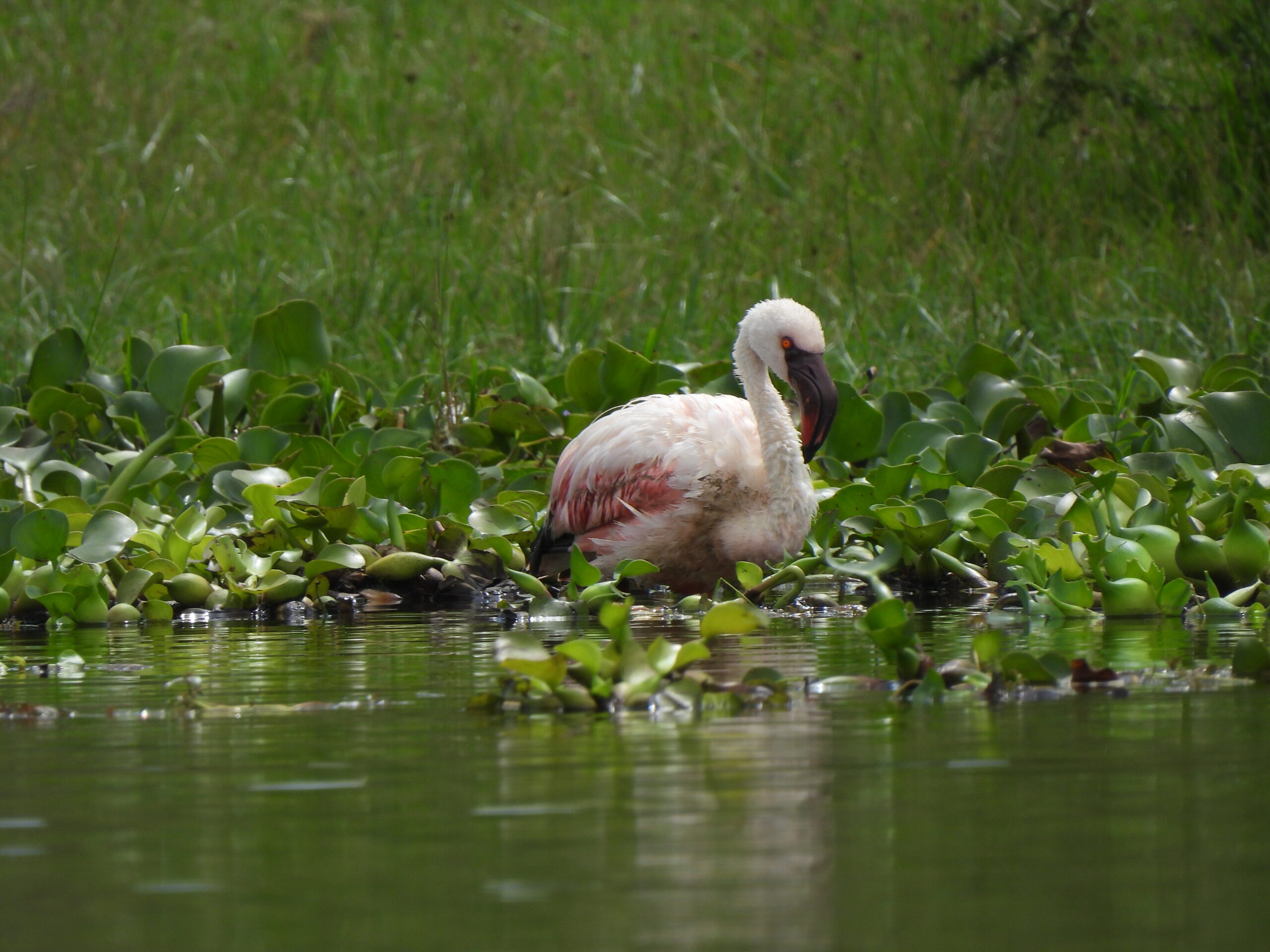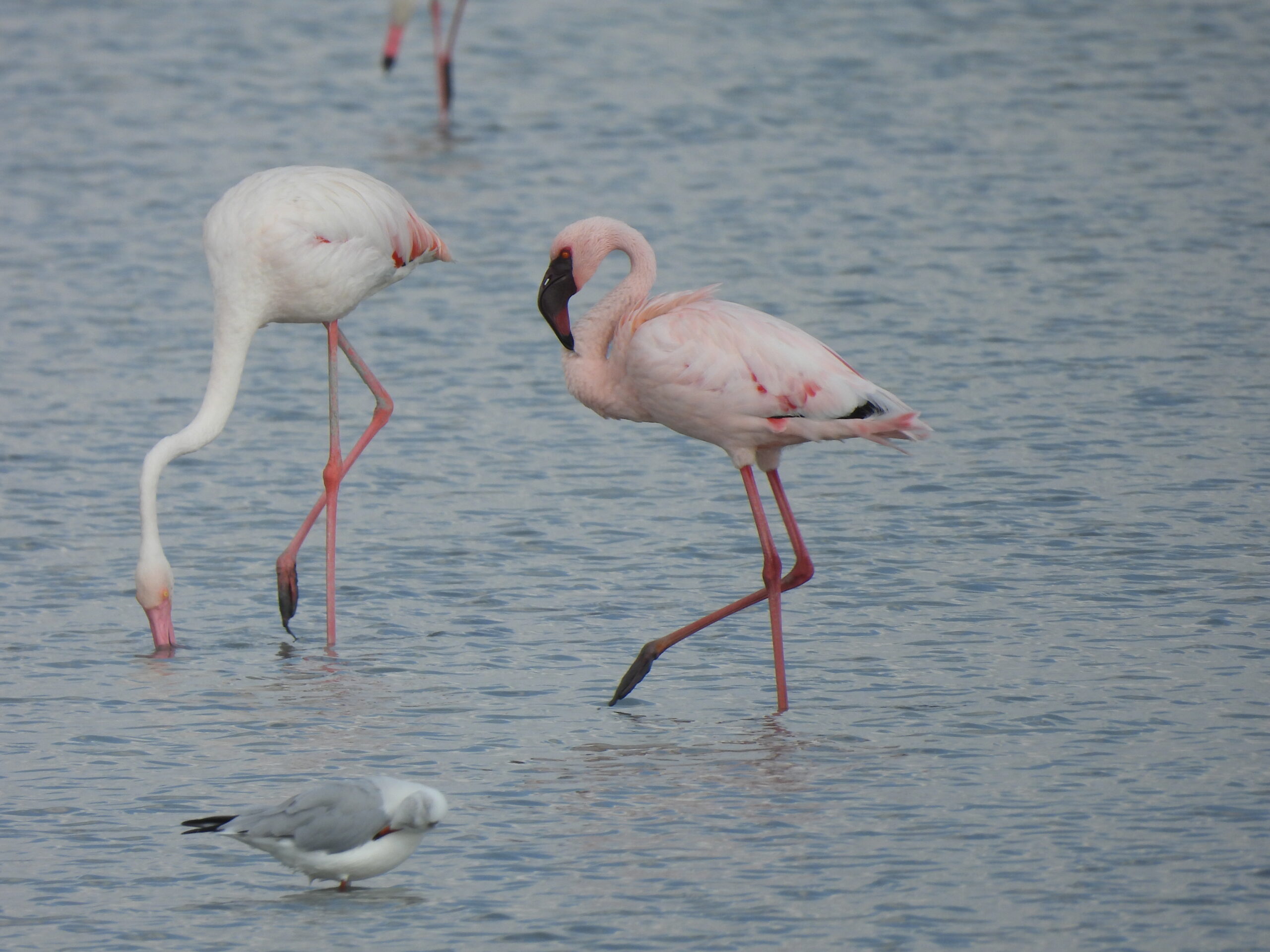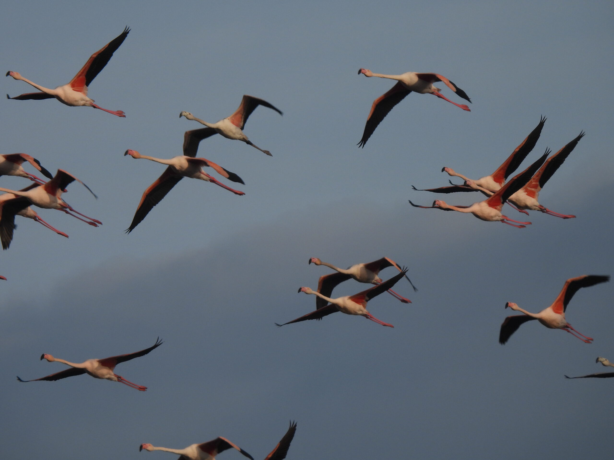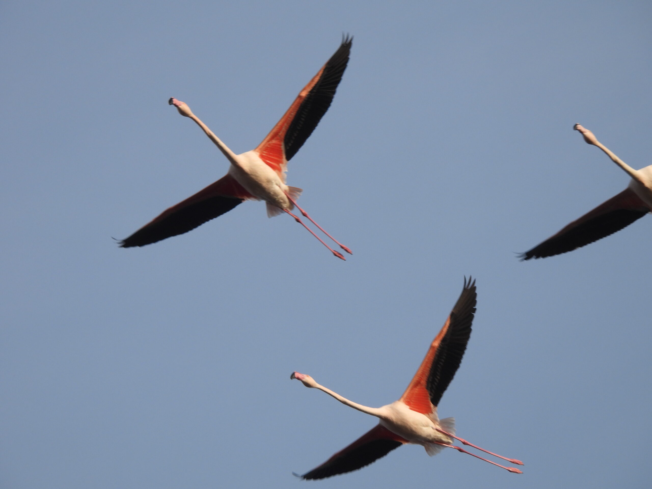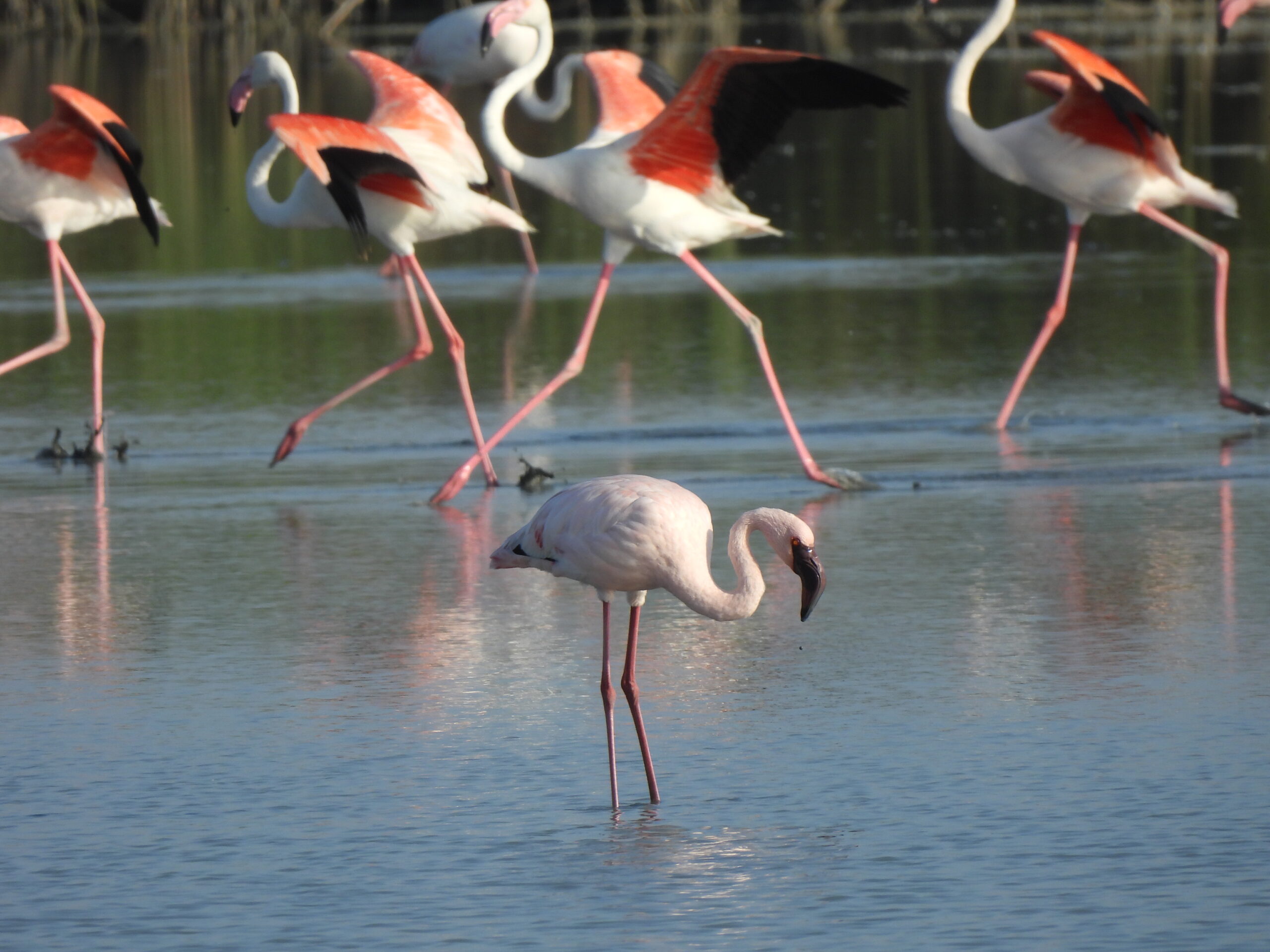 The flamingos (family Phoenicopteridae) are a family of birds belonging to the monotypic order Phoenicopteriformes. These wading birds have specialized upside down bills adapted to filtering water mainly for brine shrimp and other plankton on mud. Their food is rich in carotenes, giving them a characteristic pink plumage. They forage in large flocks known as flamboyances, performing synchronized ritualized courtship displays and and breeding colonially in mud nests, feeding the chicks crop milk.
