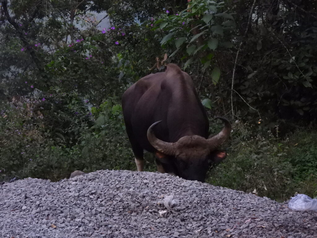 We took one of the last buses down to the park gate and were driven through the picturesque town of Munnar. While heading away, a massive male gaur (Bos gaurus) grazed on the roadside, imposing and ignorant of the traffic just meters next to it.