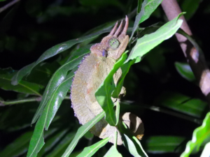 Once the tent was ready, a long nap transported us to night time. After a light dinner, a quick walk around resulted in a couple of Jackson’s chameleons on the spotlight, sleeping in a bush on the roadside inside the camp. We were embraced by the sounds of the African night and quickly fell asleep again.